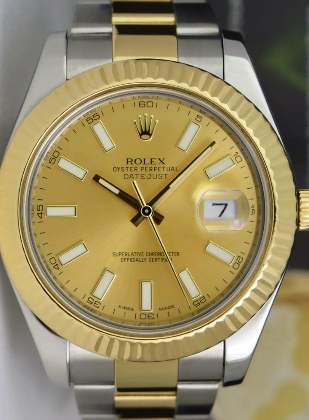 Absolutely Stunning brilliant Rolex Champagne Index Dial! This is the 41mm 18kt Yellow Gold & Stainless Steel Rolex Datejust II model 116333: This is the style with the Rolex Stainless Steel Oyster bracelet. This Rolex is in pristine condition…Priced to sell immediately!