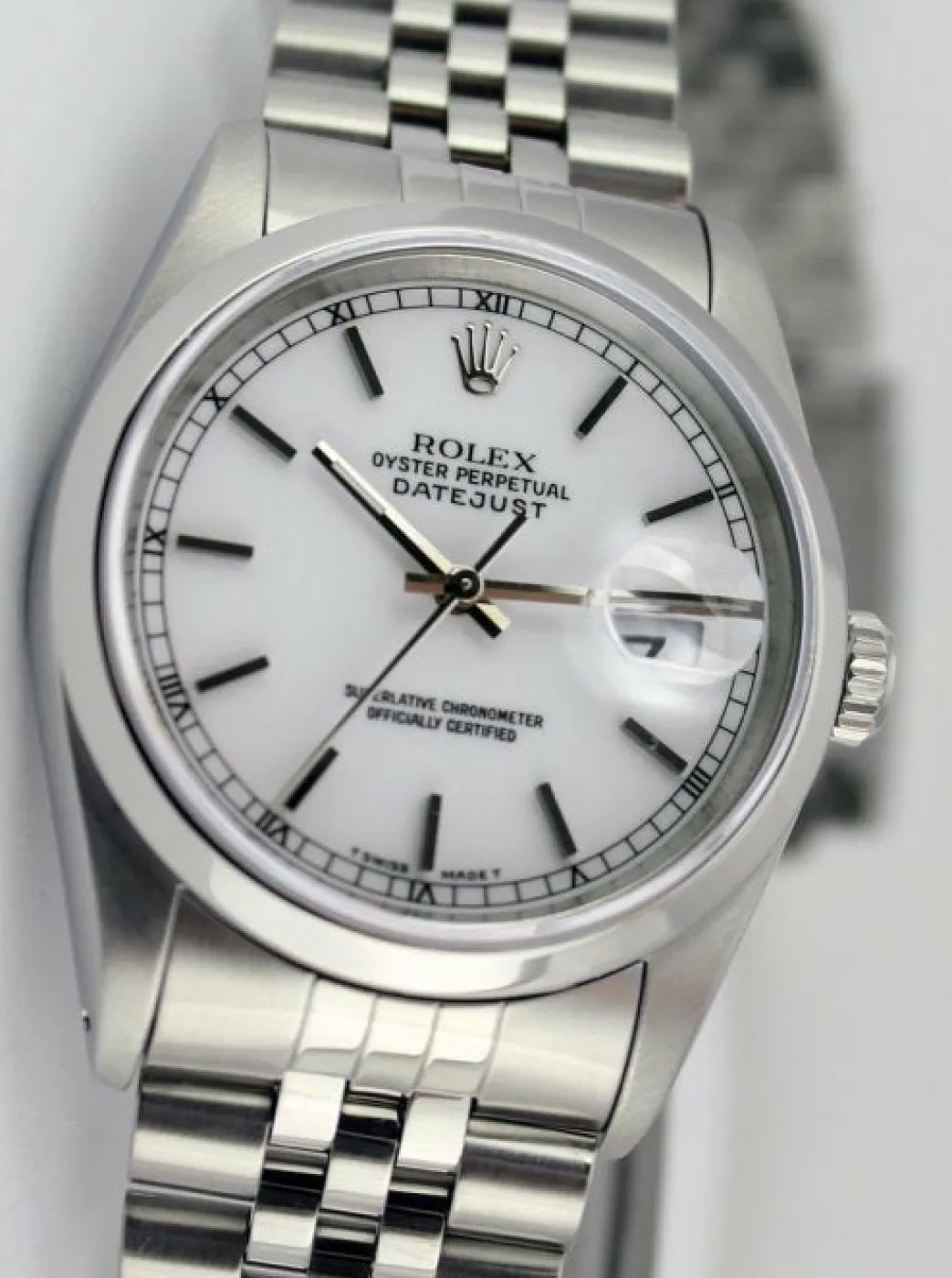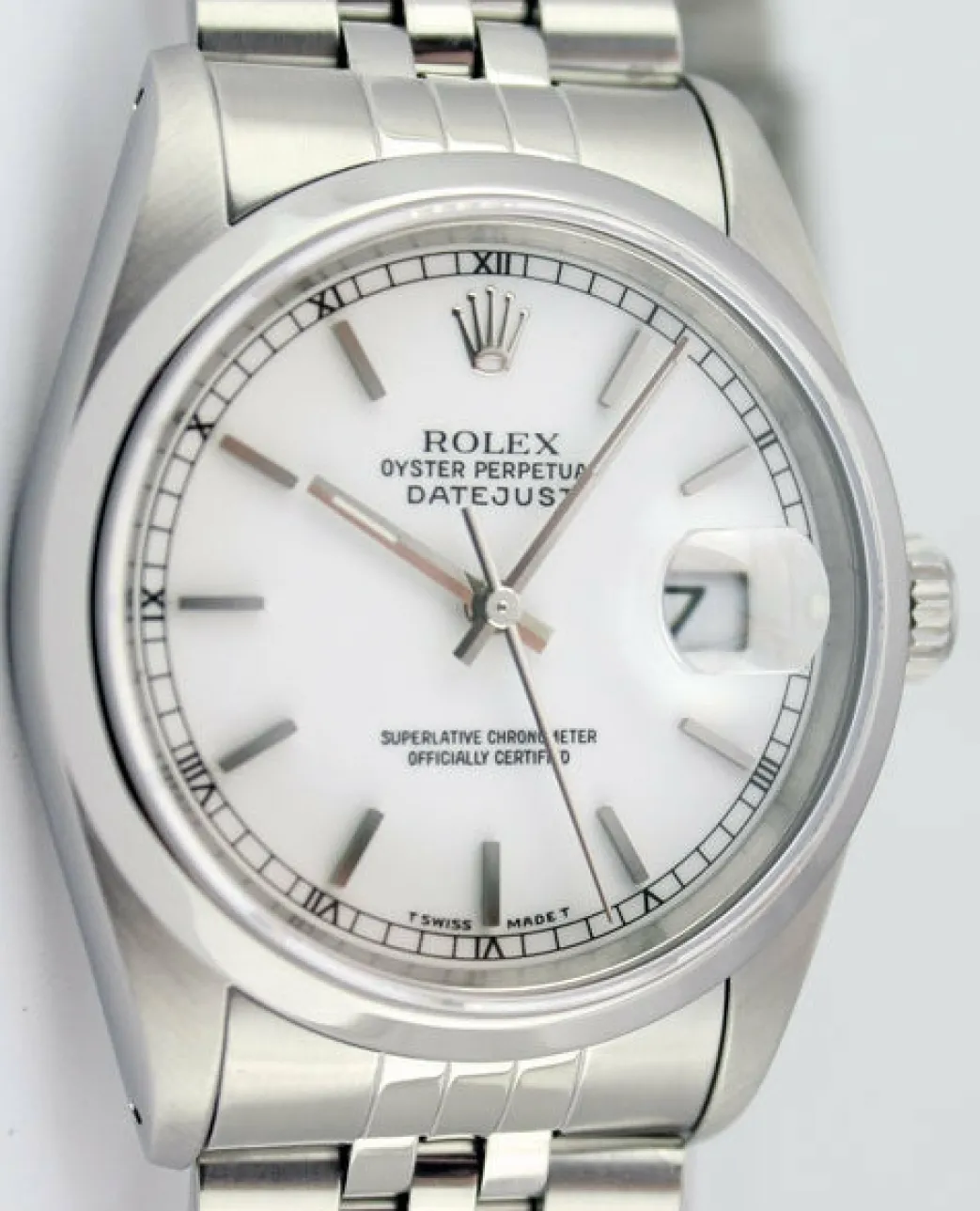 Absolutely Stunning brilliant White Stick Dial! This is the 36mm size Stainless Steel Rolex Datejust model 16200: This is the style with the Rolex Stainless Steel bracelet. This Rolex is in pristine condition…Priced to sell immediately!