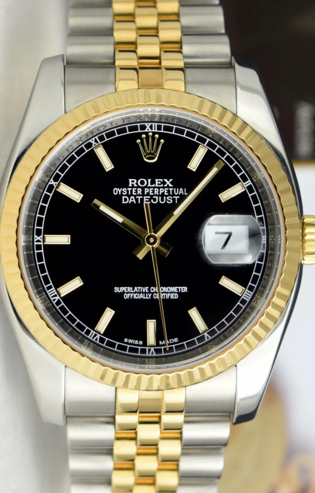 Absolutely Stunning brilliant Rolex Black Index Dial! This is the 36mm size 18kt Yellow Gold & Stainless Steel Rolex Datejust model Model 116233: This is the style with the Rolex 18kt Gold & Stainless Steel bracelet. To replace this Rolex has an estimated MSRP of $10,400. This Rolex is in pristine condition…Priced to sell immediately!
