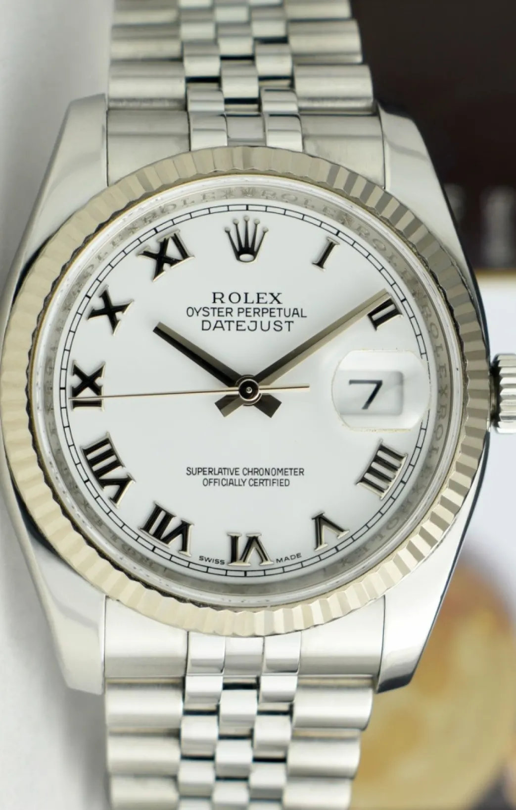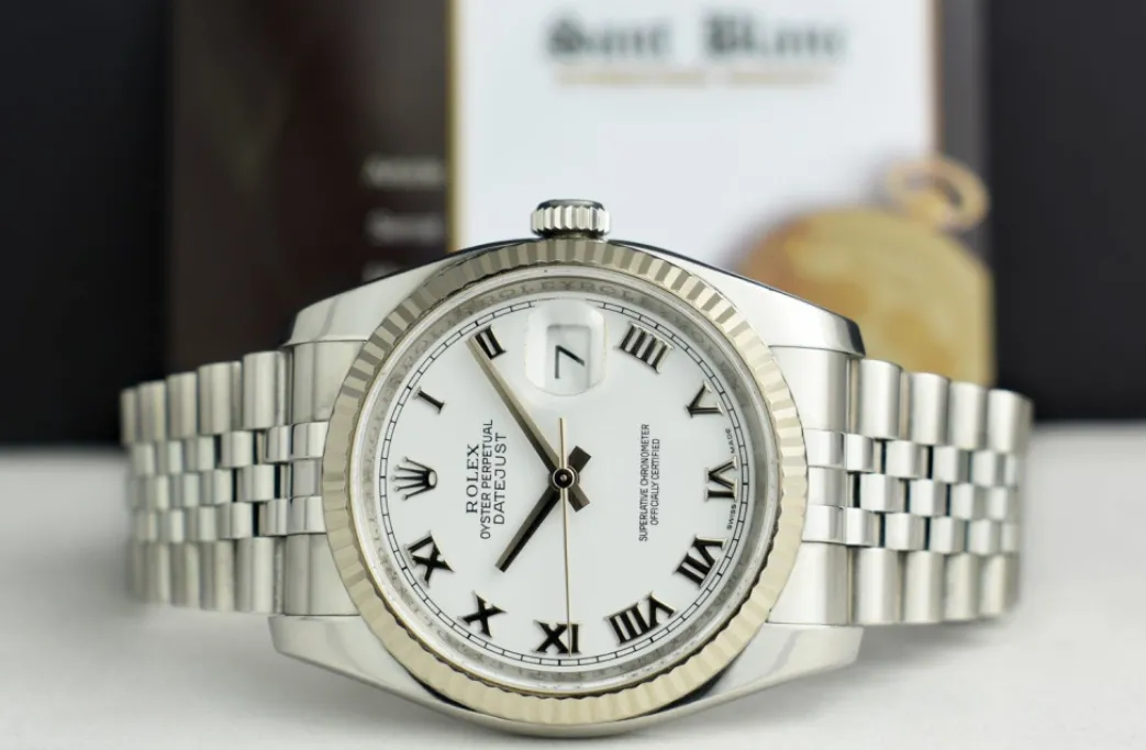 ROLEX REHAUT – This Datejust 116234 is a later model with the Inner Bezel Engraving! Absolutely Stunning brilliant Rolex White Roman Dial! This is the 36mm size 18kt White Gold & Stainless Steel Rolex DateJust model 116234: This is the style with the Rolex Stainless Steel bracelet. This Rolex is in pristine condition…Priced to sell immediately!