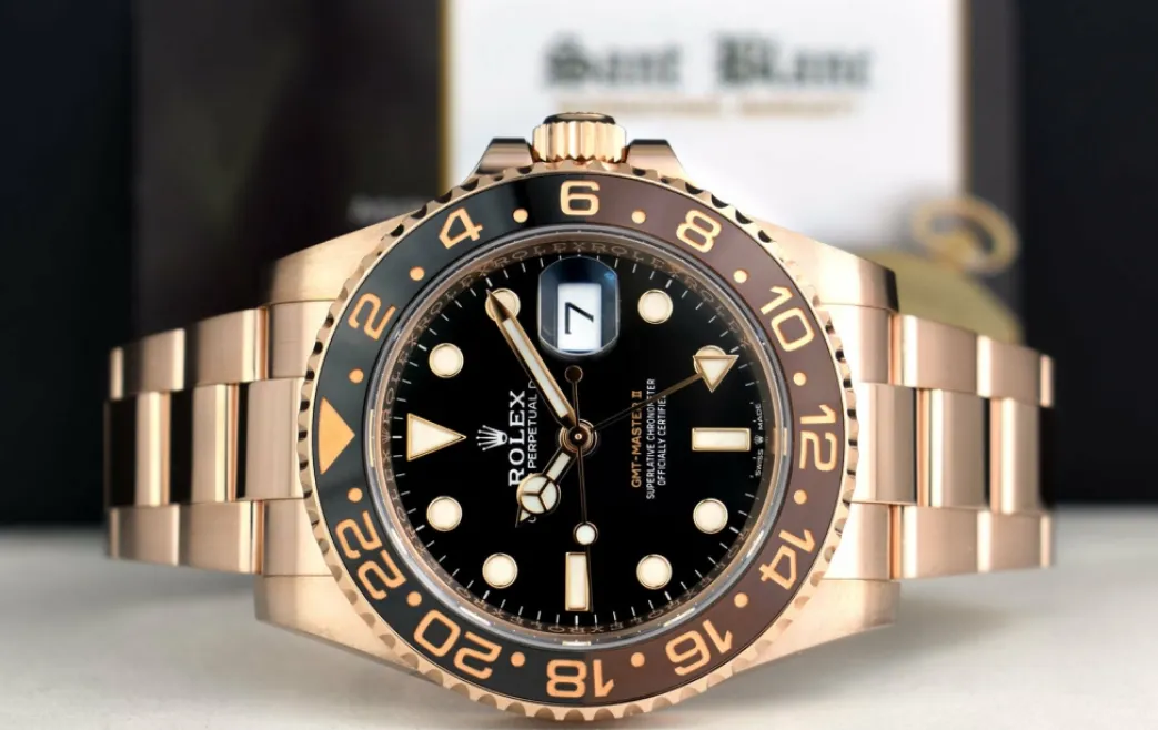 Absolutely Stunning brilliant Rolex Black Index Dial and Black & Brown “Root beer” ceramic bezel! This is the 40mm size 18kt Everose Gold Rolex GMT Master II model 126715CHNR: This is the style with the Rolex 18kt Everose Gold bracelet. This Rolex is in pristine condition…Priced to sell immediately!