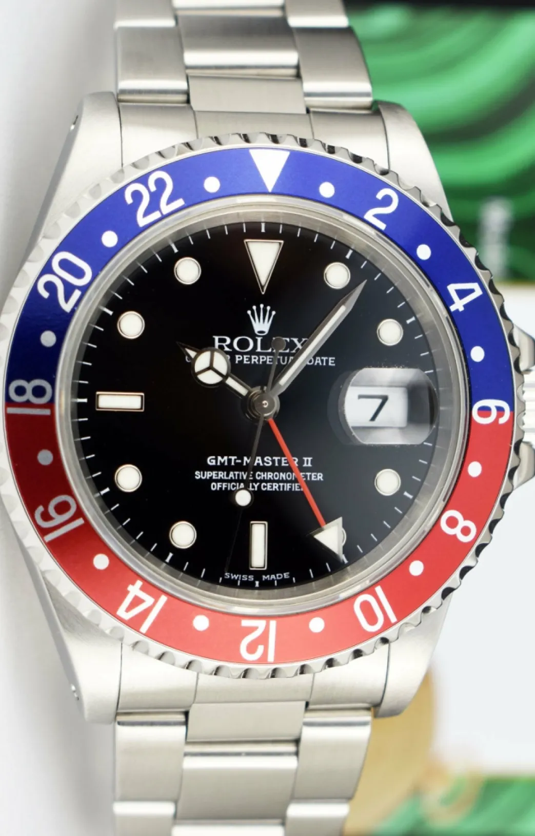 Absolutely Stunning brilliant Rolex Black Index Dial and Blue & Red “Pepsi” Bezel! This is the 40mm size Stainless Steel Rolex GMT Master II model 16710: This is the style with the Rolex Stainless Steel bracelet. This Rolex is in pristine condition…Priced to sell immediately!