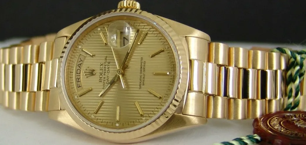 Absolutely stunning! Brilliant Rolex Champagne Tapestry Stick Dial! This is the Rolex 36mm Day-Date President model: This is the style with the Rolex 18kt Yellow Gold President bracelet. This Rolex is in pristine condition…Priced to sell immediately!