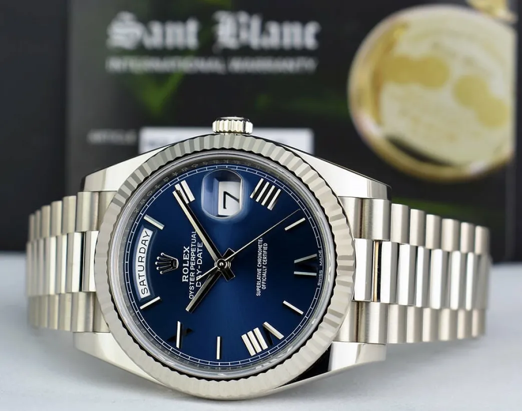 Absolutely Stunning brilliant Rolex Blue Roman Dial! This is the 40mm size 18kt White Gold Day Date 40 President: This is the style with the Rolex 18kt White Gold bracelet. To replace this Rolex has an estimated MSRP of $37,550. This Rolex is in pristine condition…Priced to sell immediately!