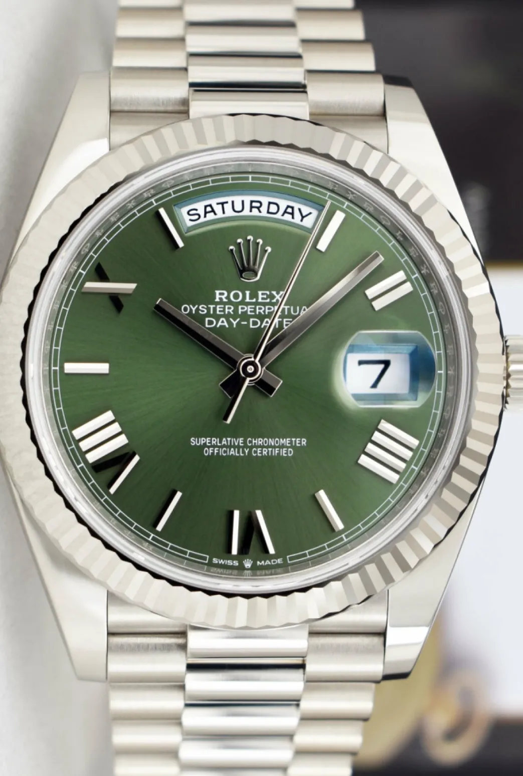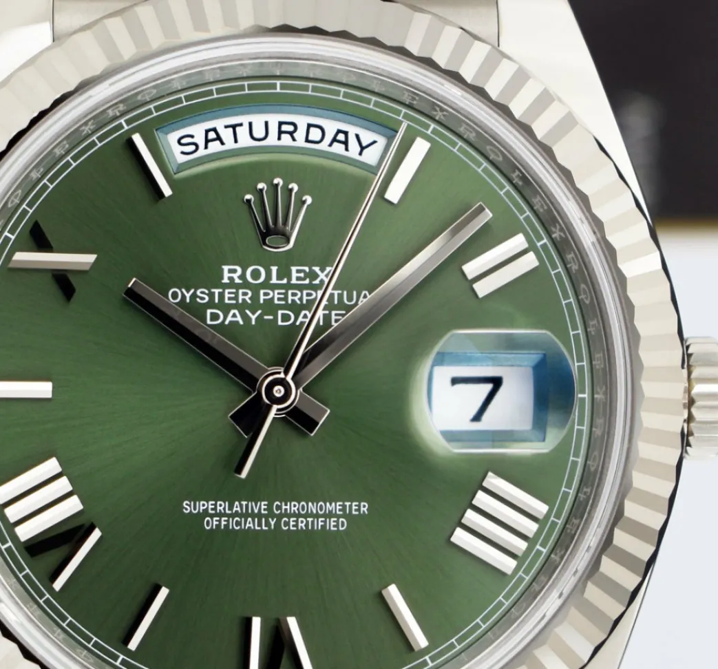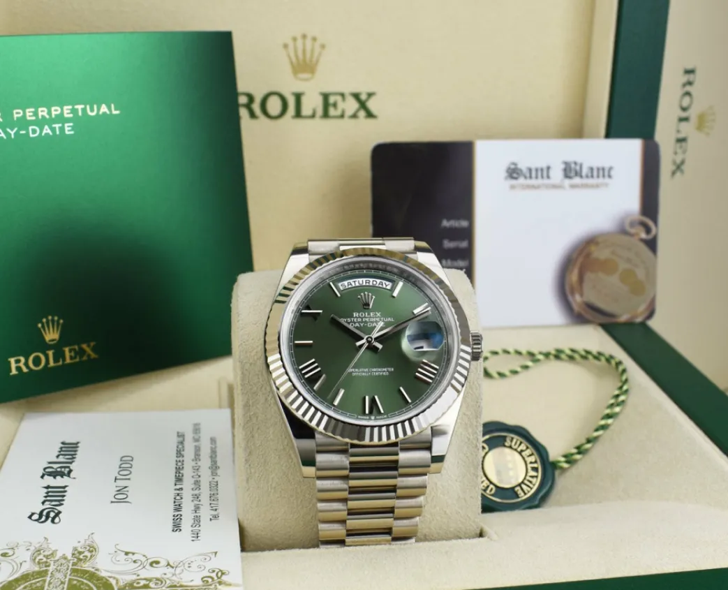 Absolutely Stunning brilliant Rolex Green Roman Dial! This is the 40mm size 18kt White Gold Rolex Day-Date 40 President model 228239: This is the style with the Rolex 18kt White Gold bracelet. This Rolex is in pristine condition…Priced to sell immediately!