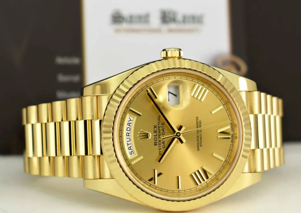 Absolutely Stunning brilliant Rolex Champagne Roman Dial! This is the 40mm size 18kt Gold Rolex Day Date model 228238: This is the style with the Rolex 18kt Gold President bracelet. To replace this Rolex has an estimated MSRP of $36,550. This Rolex is in pristine condition…Priced to sell immediately!
