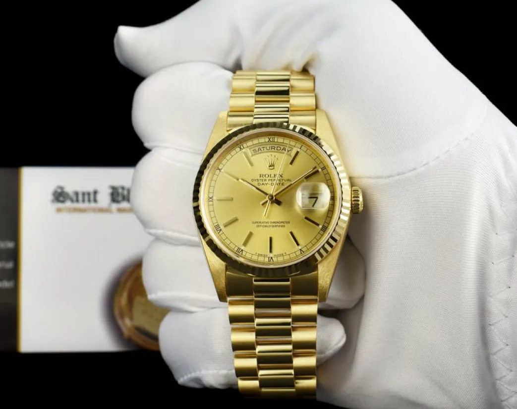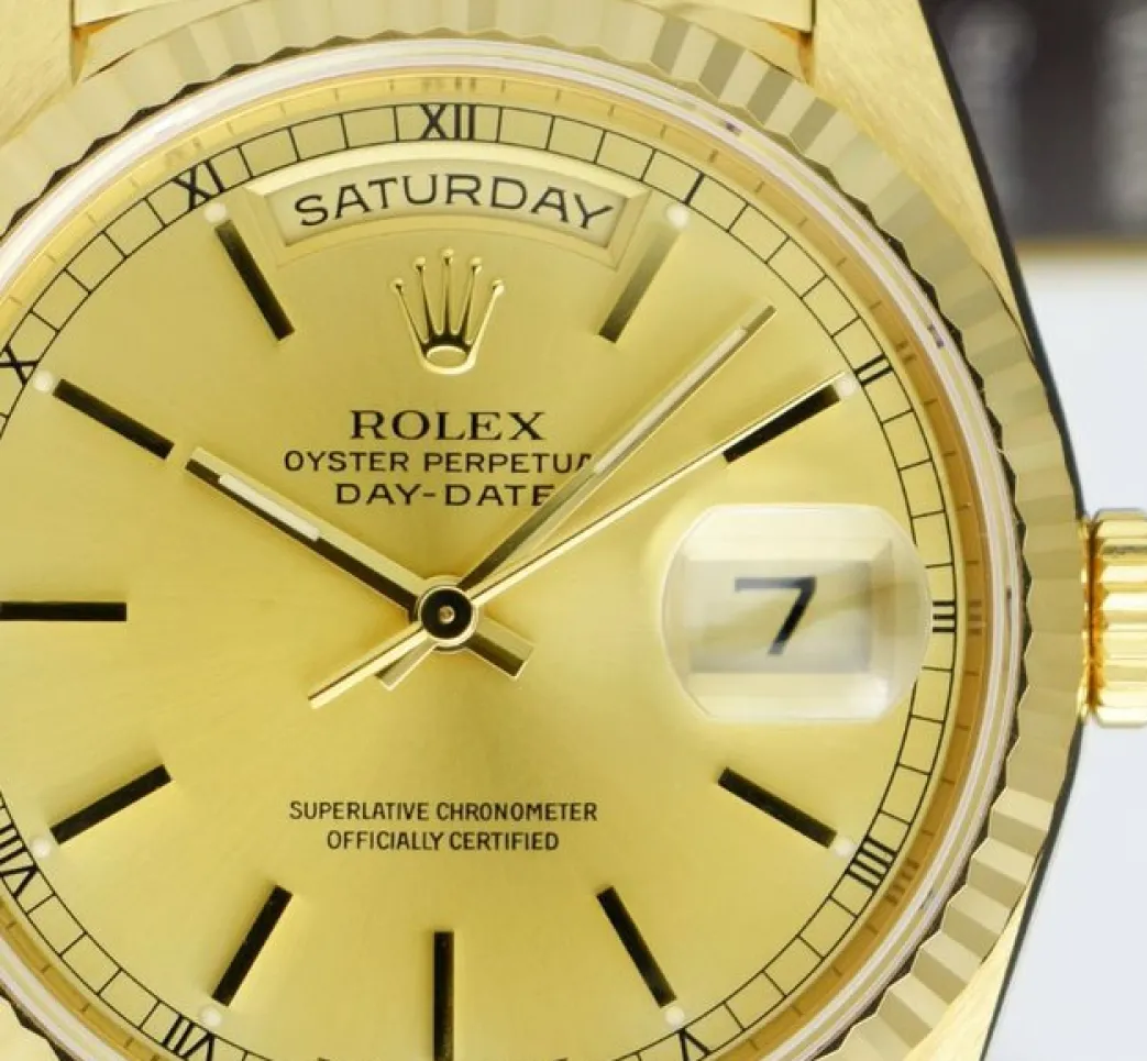 Absolutely Stunning brilliant Rolex Champagne Stick Dial! This is the 36mm size Rolex Day-Date President model 18238: This is the style with the Rolex 18kt Gold bracelet.This Rolex is in pristine condition…Priced to sell immediately!