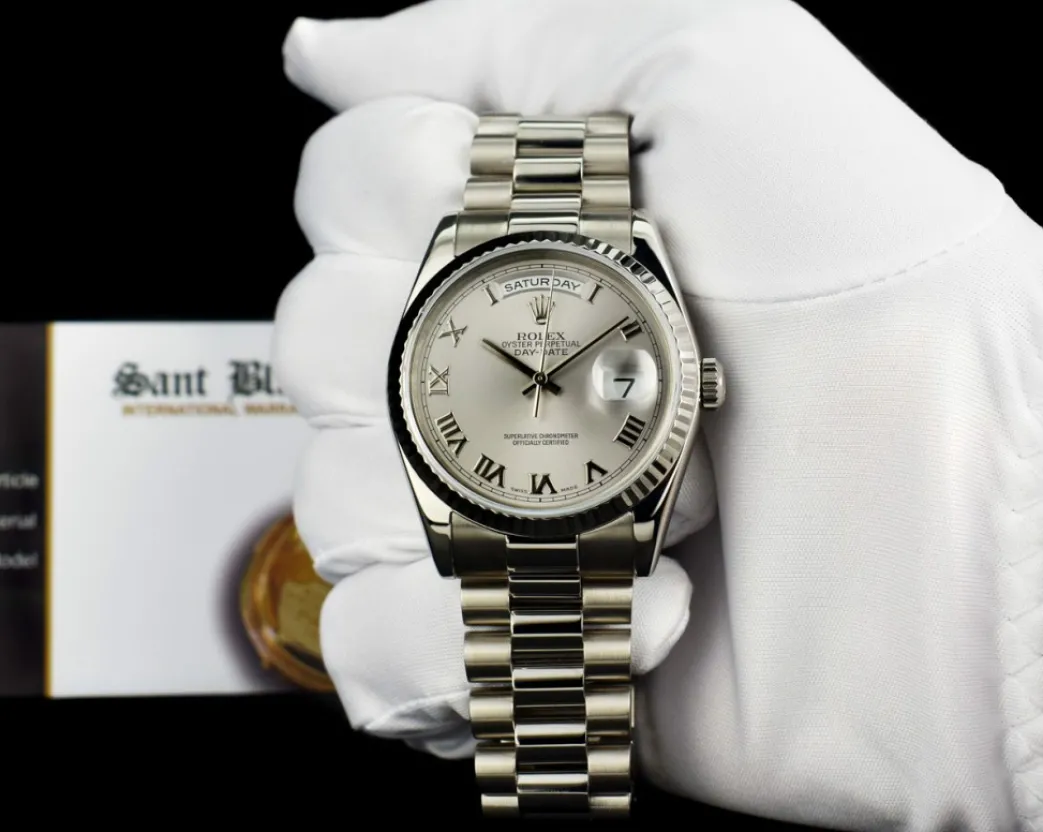 ROLEX – Absolutely Stunning brilliant Rolex Silver Roman Dial and Factory Fluted Bezel! This is the 36mm size 18kt White Gold Rolex Day-Date 36 model 118239: This is the style with the Rolex 18kt White Gold President bracelet. This Rolex is in pristine condition…Priced to sell immediately!
