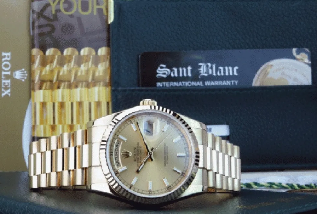 Absolutely Stunning brilliant Rolex Champagne Index Dial! This is the 36mm size 18kt Gold Rolex Day-Date model 118238: This is the style with the Rolex 18kt Gold President bracelet. To replace this Rolex has an estimated MSRP of $31,350. This Rolex is in pristine condition…Priced to sell immediately!