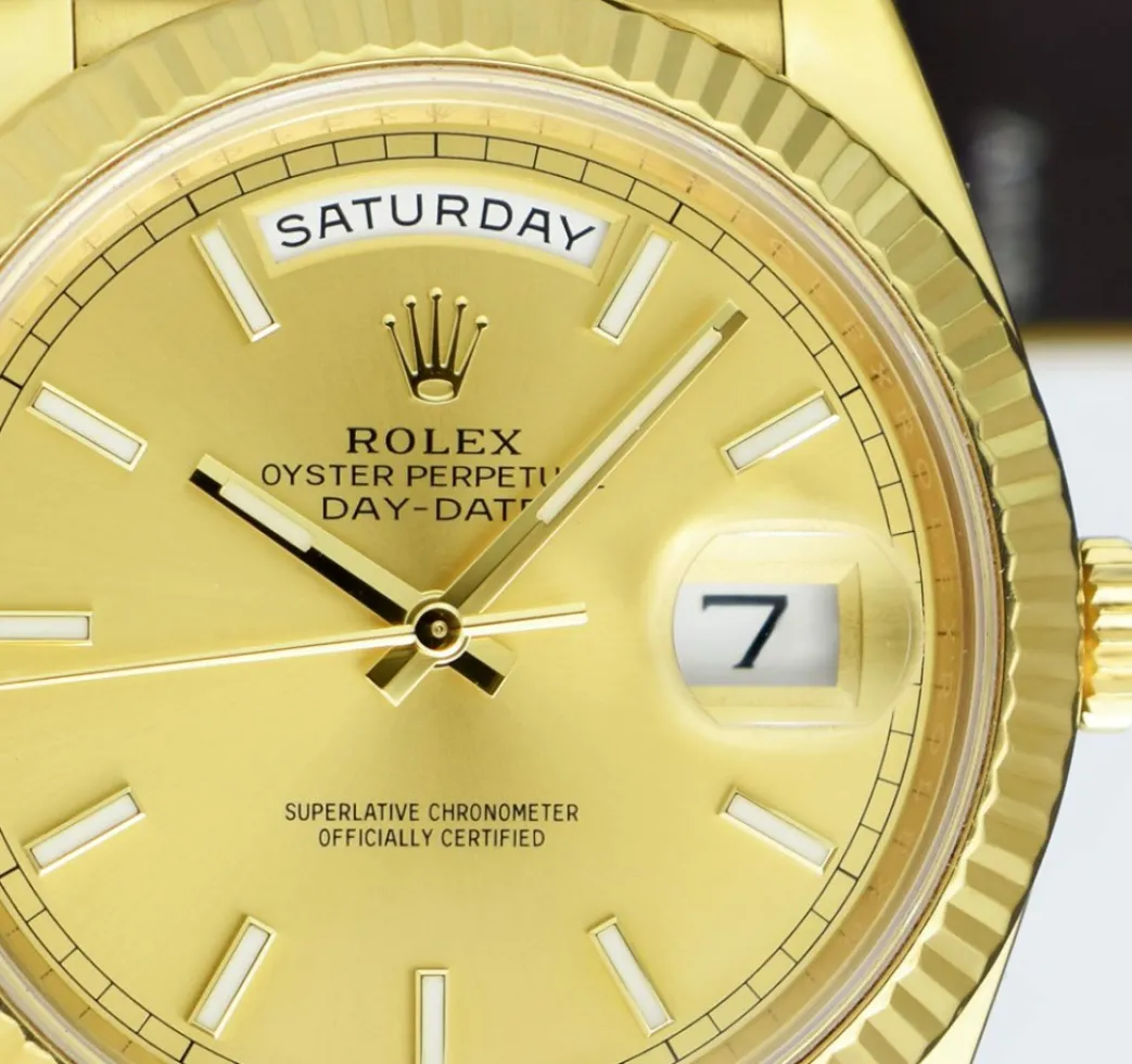 Absolutely Stunning brilliant Rolex Champagne Index Dial! This is the 40mm size 18kt Yellow Gold Rolex Day Date President model 228238: This is the style with the Rolex 18kt Gold President bracelet. This Rolex is in pristine condition…Priced to sell immediately!