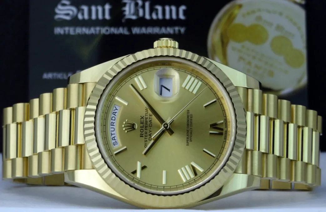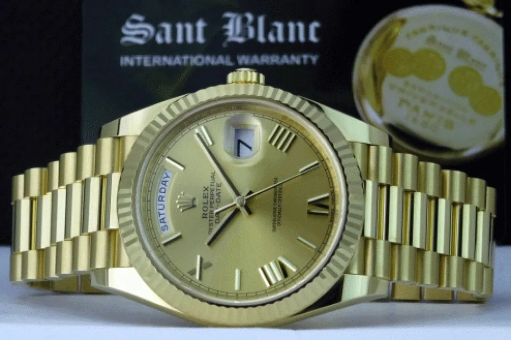 Absolutely Stunning brilliant Rolex Champagne Roman Dial! This is the 40mm size 18kt Gold Rolex Day Date model 228238: This is the style with the Rolex 18kt Gold President bracelet. To replace this Rolex has an estimated MSRP of $34,850. This Rolex is in pristine condition…Priced to sell immediately!