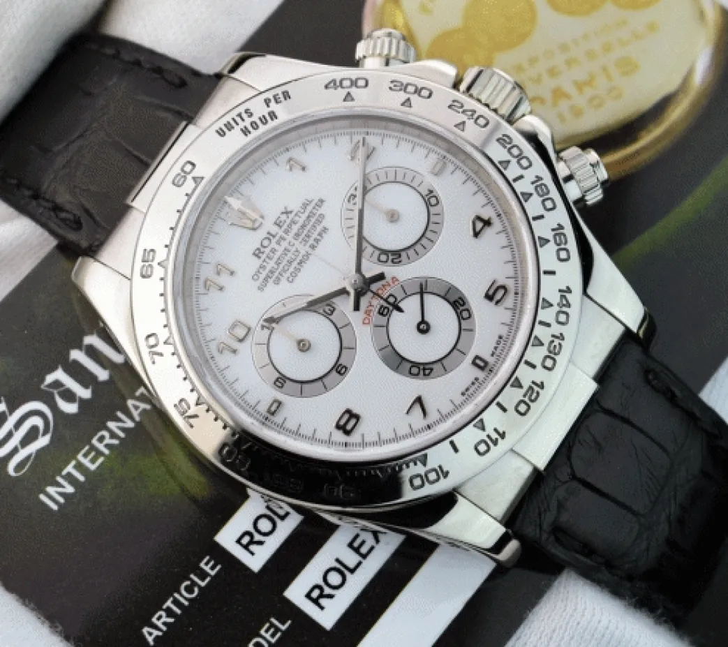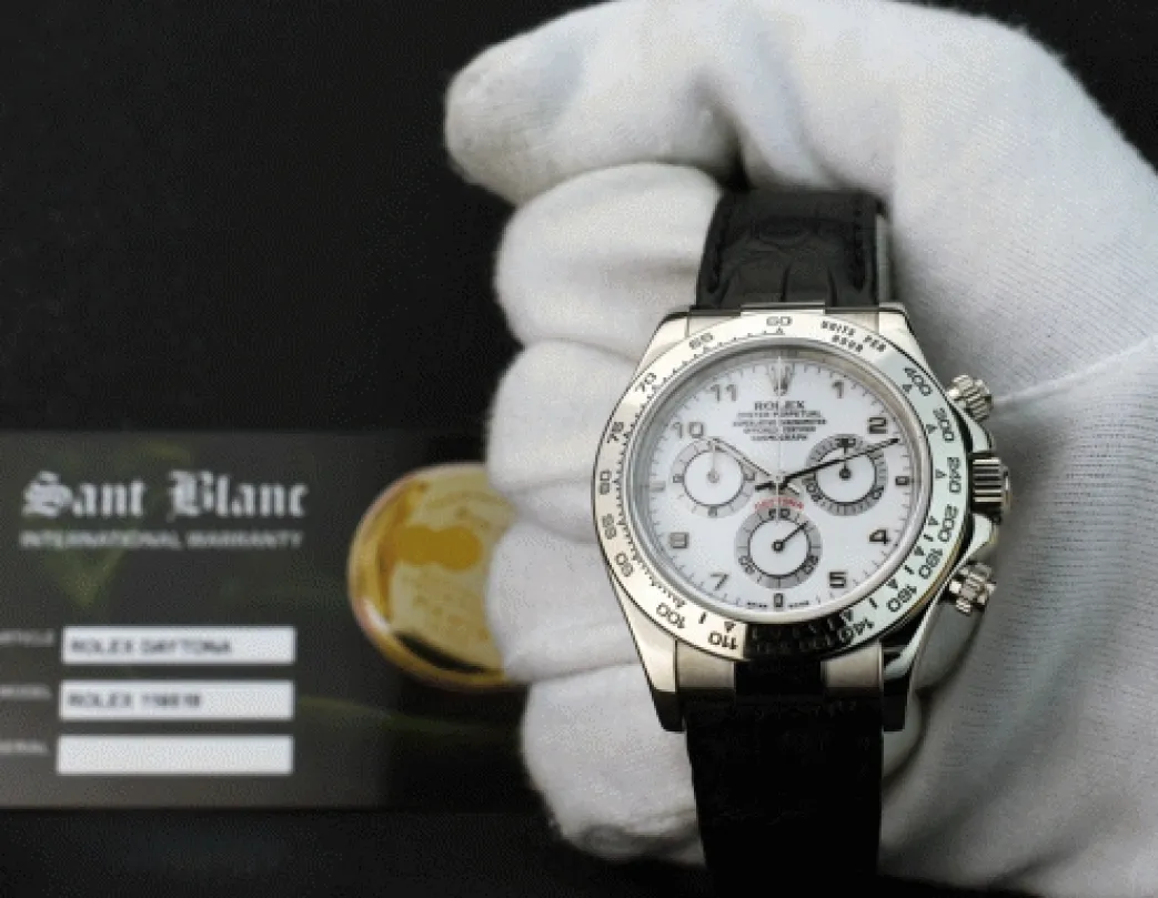 Absolutely Stunning brilliant Rolex Factory White Arabic Dial! This is the 40mm size Rolex Men’s 18kt White Gold Daytona – Rolex model 116519: This is the style with the Rolex Black Crocodile Strap. This Rolex is in pristine condition…Priced to sell immediately!