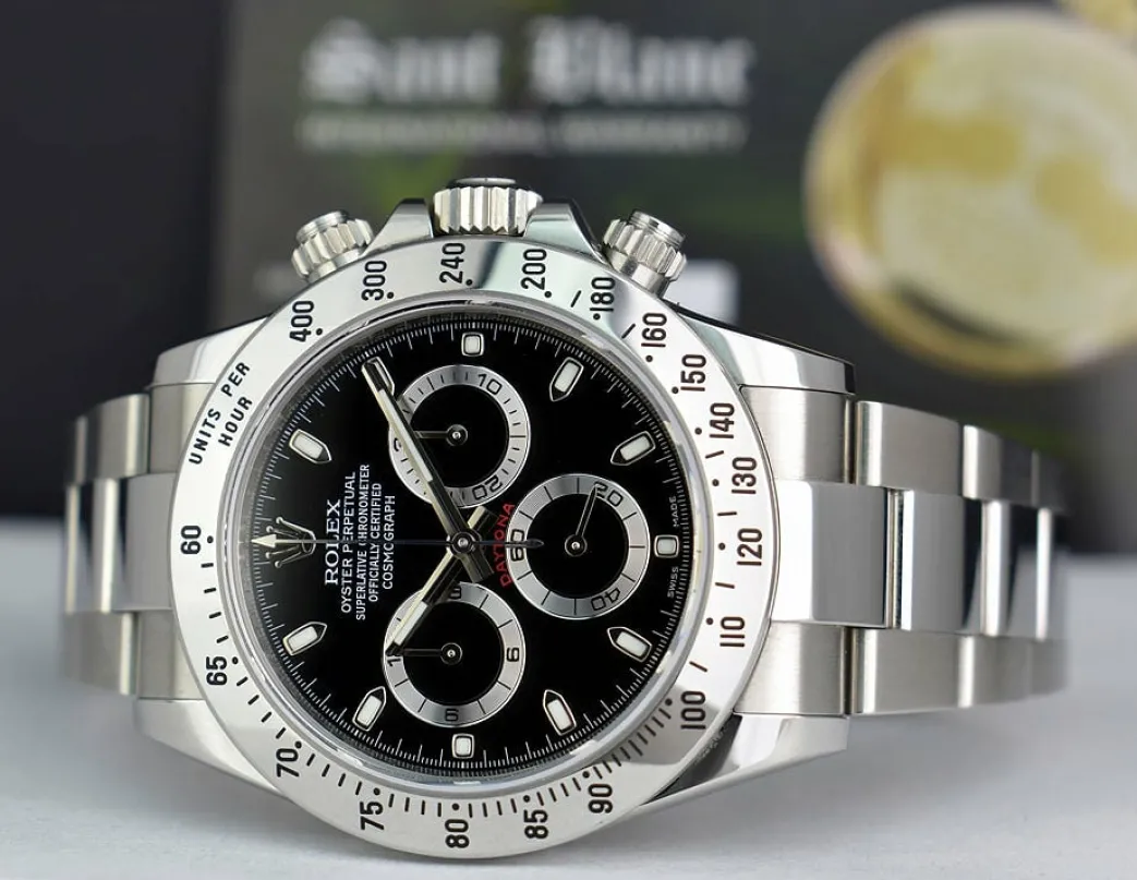 ROLEX BOX BOOKS & CARD – Comes with Original Rolex Box, Books, & Factory Rolex Card! This Daytona is a later model with the Newer “Fat” Buckle! Absolutely Stunning brilliant Rolex Factory Black Dial! This is the 40mm size Stainless Steel Rolex Daytona model 116520: This is the style with the Rolex Stainless Steel bracelet. This Rolex is in pristine condition…Priced to sell immediately!