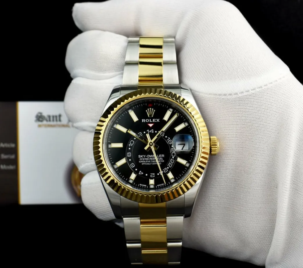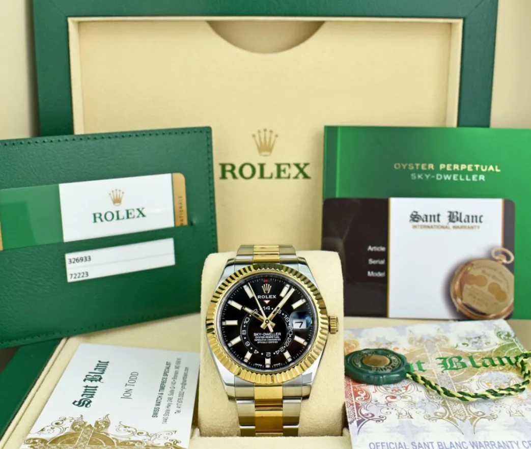 ROLEX BOX BOOKS & CARD – Comes with Original Rolex Box, Books, & Factory Rolex Card! Absolutely stunning brilliant Rolex Factory Black Index Dial! This is the 42mm size Rolex 18kt Gold and Stainless Steel Sky Dweller model 326933. This is the style with the Rolex 18kt Gold & Stainless Oyster bracelet. This Rolex is in pristine condition and priced to sell immediately! Comes with genuine Rolex presentation boxes, Rolex books, Rolex tag, Retail Appraisal and The Sant Blanc Three Year Warranty!…In pristine condition…The Perfect Gift!