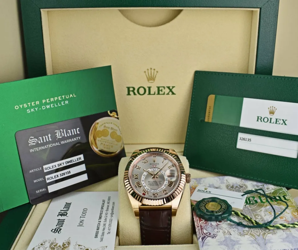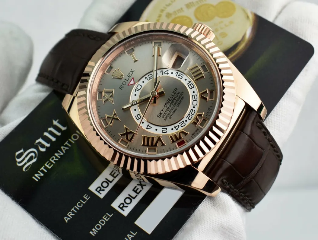 Rolex! Absolutely stunning! Brilliant Rolex Factory Silver Sundust Roman Dial! This is the Rolex 42mm 18kt Everose Gold SkyDweller – Rolex model 326135. This is the style with the Rolex Leather Strap. This Rolex is in pristine condition and priced to sell immediately!