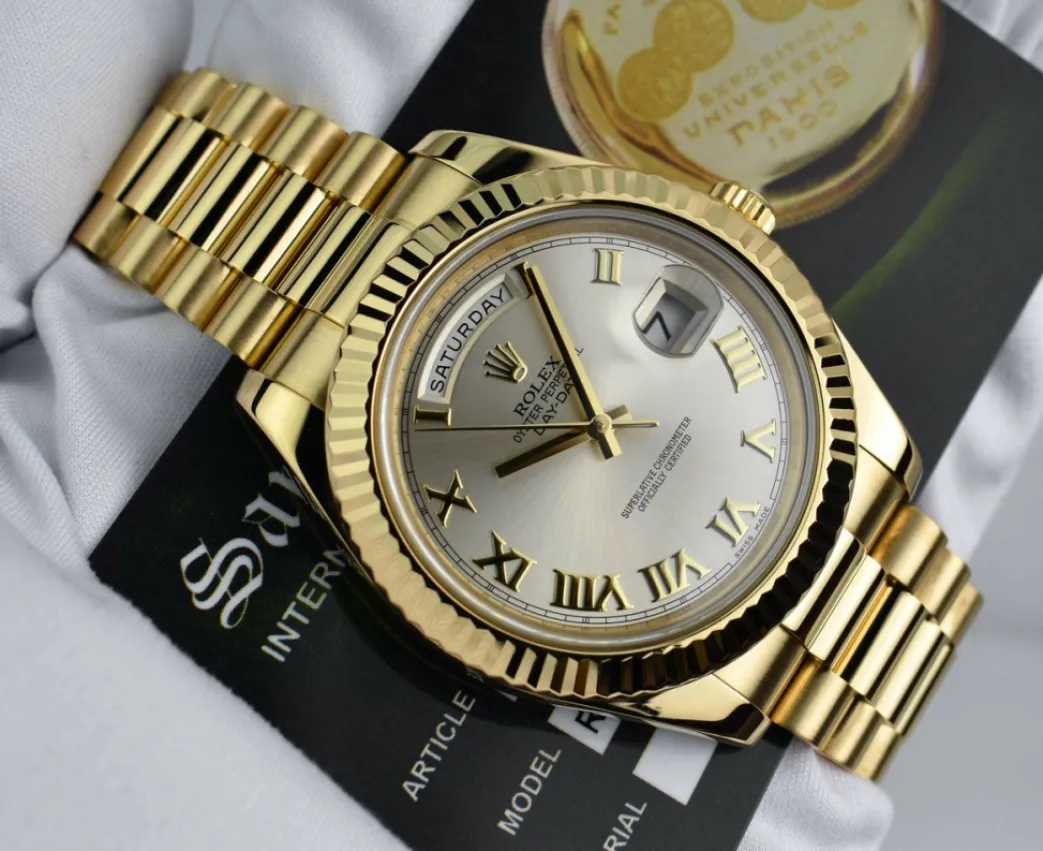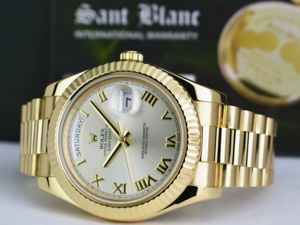 Absolutely stunning! Brilliant Rolex Silver Roman Dial! This is the 41mm size Rolex Day-Date II model 218238: This is the style with the Rolex 18kt Yellow Gold bracelet. This Rolex is in pristine condition…Priced to sell immediately!