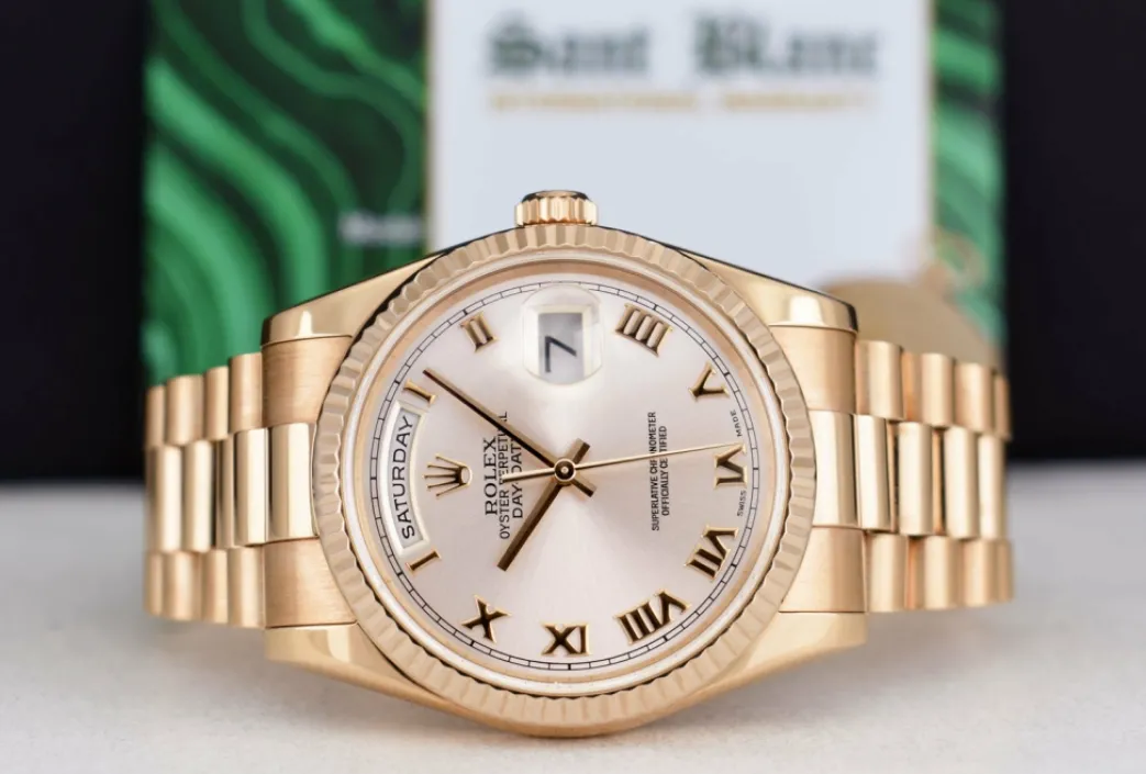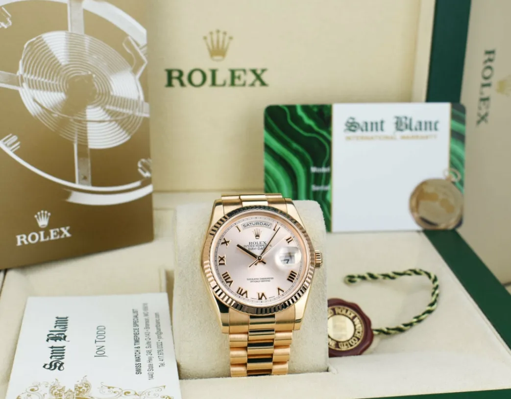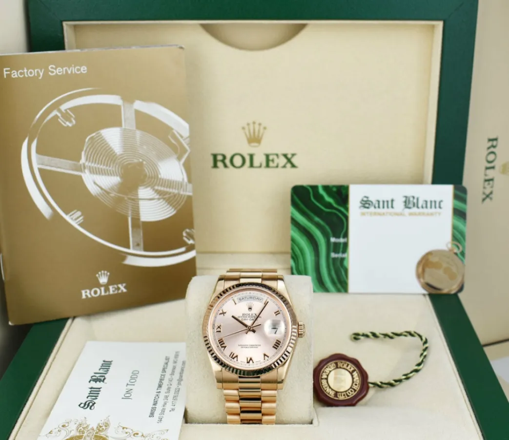 Absolutely Stunning brilliant Rolex Rose Roman Dial and Factory Fluted Bezel! This is the 36mm size 18kt Everose Gold Rolex Day-Date President model 118235: This is the style with the Rolex 18kt Everose Gold bracelet.This Rolex is in pristine condition…Priced to sell immediately!