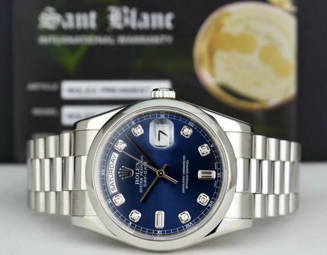 Absolutely Stunning brilliant Rolex Blue Diamond Dial! This is the 36mm size Platinum Rolex Day-Date President model 118206: This is the style with the Rolex Platinum bracelet. To replace this Rolex has an estimated MSRP of $60,600. This Rolex is in pristine condition…Priced to sell immediately!