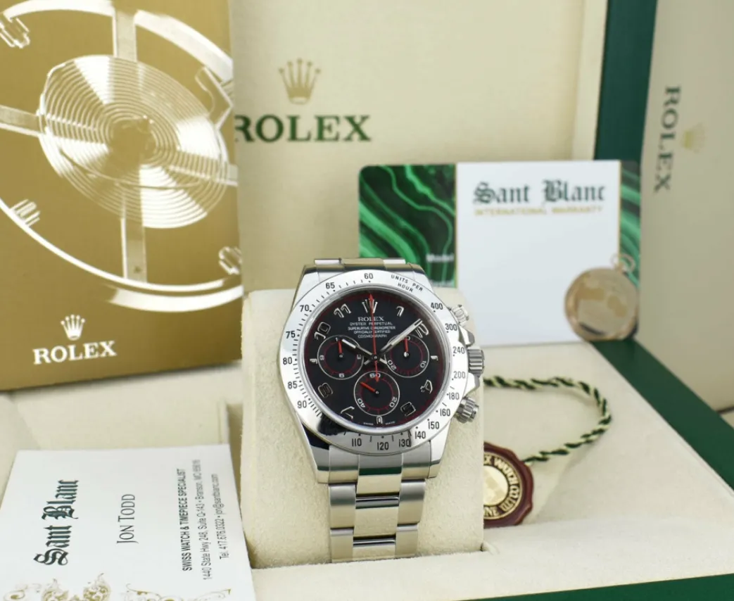 Absolutely Stunning brilliant Rolex Factory Black Arabic “Race” Dial! This is the 40mm size Stainless Steel Daytona model 116520: This is the style with the Rolex Stainless Steel bracelet. This Rolex is in pristine condition…Priced to sell immediately!