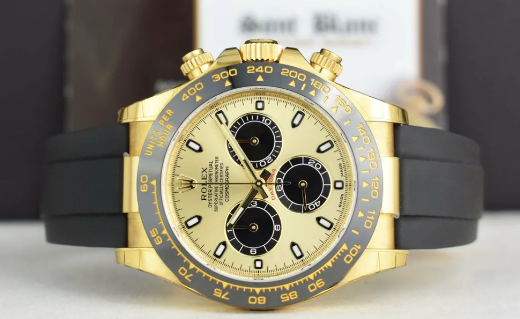 ROLEX – Absolutely Stunning brilliant Rolex Factory Champagne Gold “Paul Newman” Index Dial! This is the 40mm size 18kt Gold Rolex Daytona model 116518LN: This is the Daytona with the Rolex Oysterflex Rubber Strap. This Rolex is in pristine condition…Priced to sell immediately!