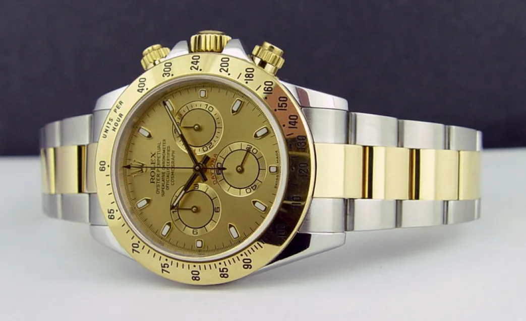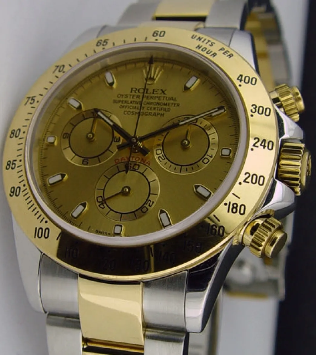 Absolutely Stunning brilliant Rolex Factory Champagne Index Dial! This is the 40mm size 18kt Gold & Stainless Steel Rolex Men’s Daytona – Rolex model 116523: This is the style with the Rolex 18kt Gold & Stainless bracelet. This Rolex is in pristine condition…Priced to sell immediately!
