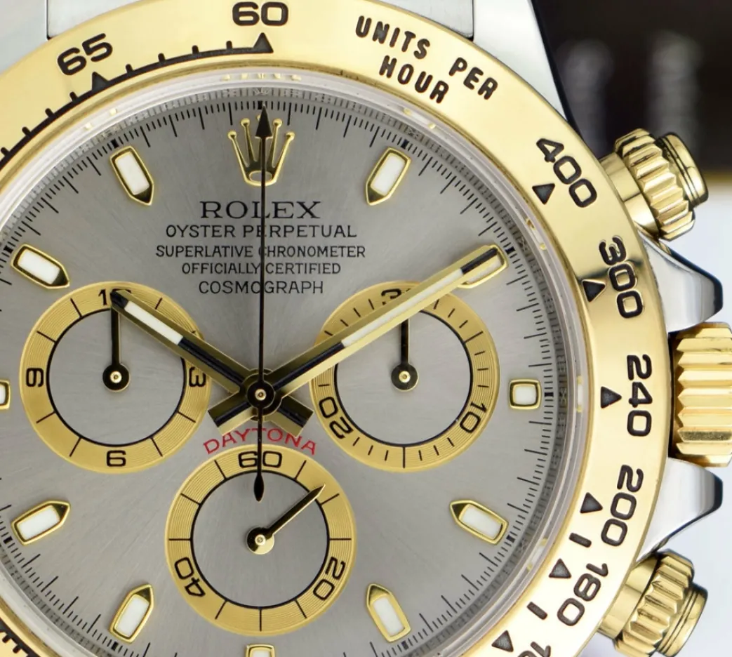 ROLEX FAT BUCKLE – This Daytona is a later model with Inner Bezel Engraving and the newer “Fat” clasp! Absolutely Stunning brilliant Rolex Factory Slate Index Dial! This is the 40mm size 18kt Gold & Stainless Steel Rolex Men’s Daytona – Rolex model 116503: This is the style with the Rolex 18kt Gold & Stainless bracelet. To replace this Rolex has an estimated MSRP of $17,400. This Rolex is in pristine condition…Priced to sell immediately!