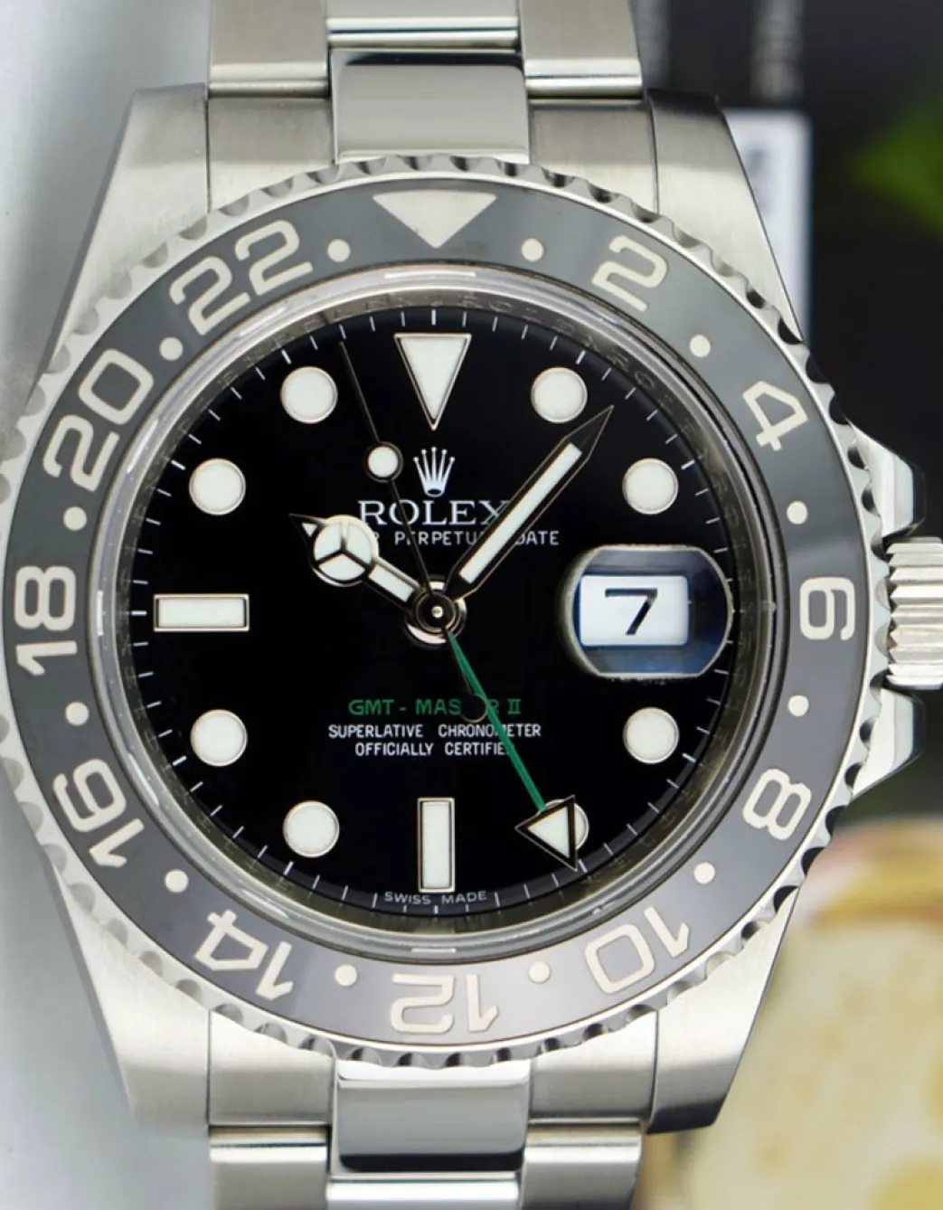 Absolutely Stunning brilliant Rolex Black Index Dial! This is the 40mm size Stainless Steel Rolex GMT Master II model 116710LN: This is the newest style with the Rolex Stainless Steel bracelet. This Rolex is in pristine condition…Priced to sell immediately!