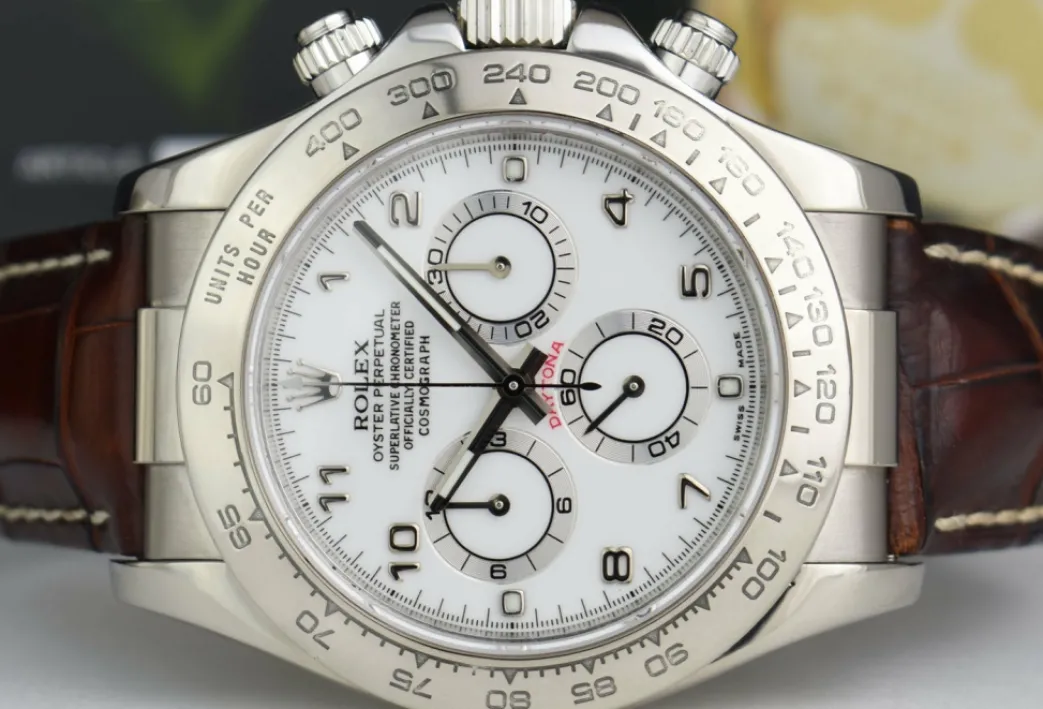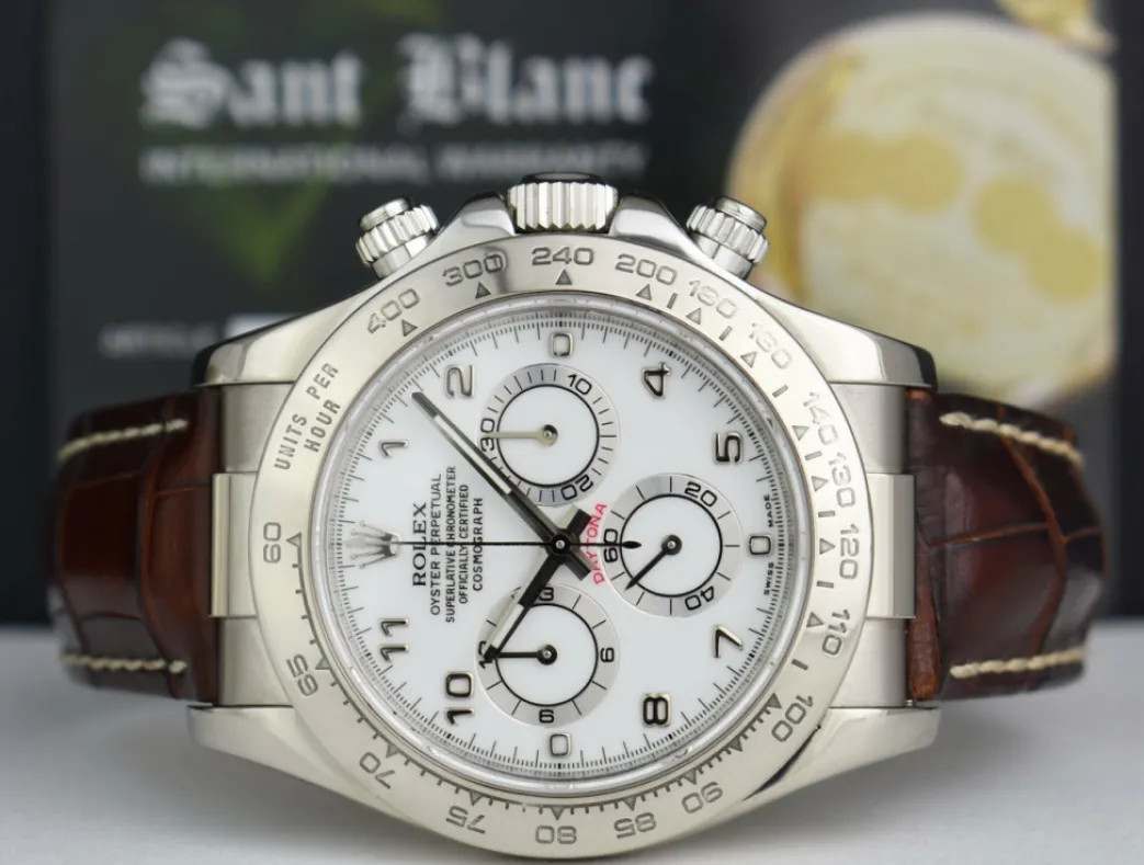 Absolutely Stunning brilliant Rolex Factory White Arabic Dial! This is the 40mm size Rolex Men’s 18kt White Gold Daytona – Rolex model 116519: This is the style with the Rolex Brown Crocodile Strap. This Rolex is in pristine condition…Priced to sell immediately!