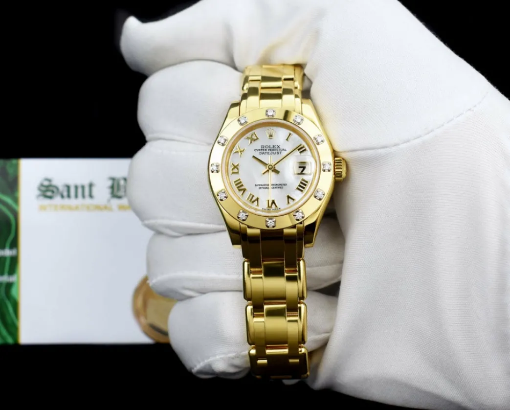 Absolutely Stunning brilliant Rolex Mother of Pearl Roman Dial! This is the 29mm size 18kt Yellow Gold Rolex Ladies Datejust Pearlmaster – Rolex model 80318: This is the style with the Rolex 18kt Yellow Gold bracelet. This Rolex is in pristine condition…Priced to sell immediately!