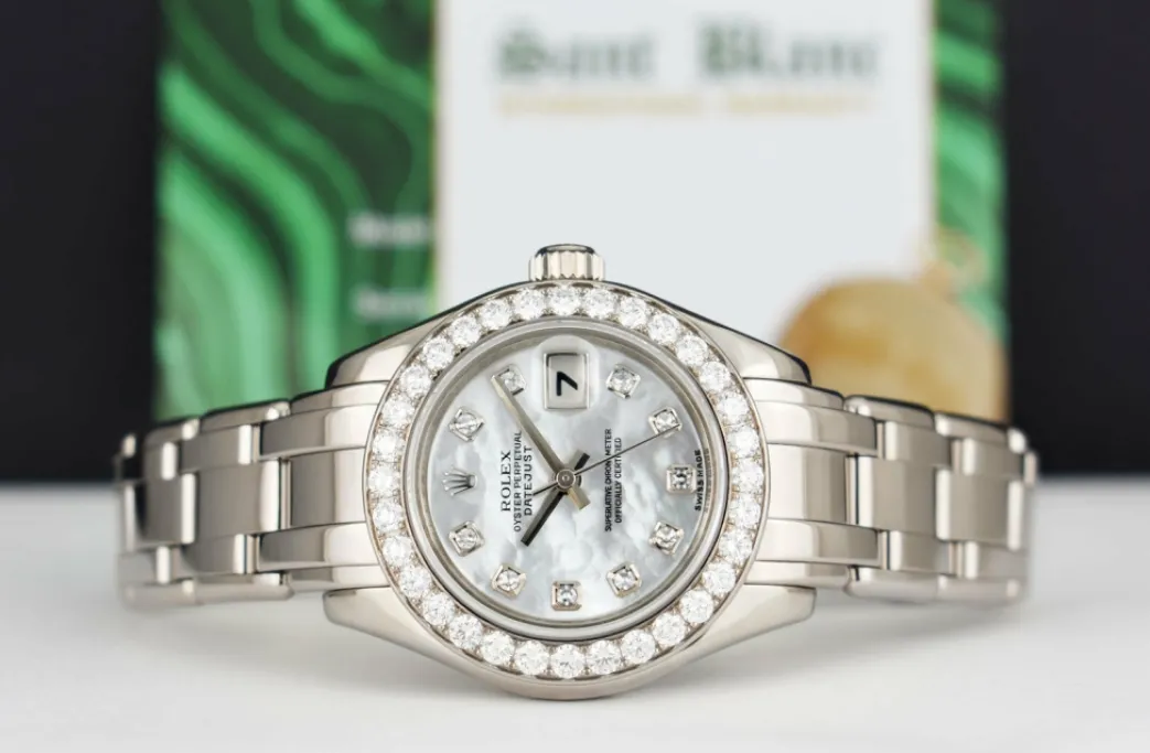 ROLEX REHAUT – This Pearlmaster is a later model with Inner Bezel Engraving (Rehaut)! Absolutely Stunning brilliant Rolex Mother of Pearl Diamond Dial! This is the 29mm size 18kt White Gold Rolex Ladies Datejust Pearlmaster model 80299: This is the style with the Rolex 18kt White Gold bracelet. This Rolex is in pristine condition…Priced to sell immediately!