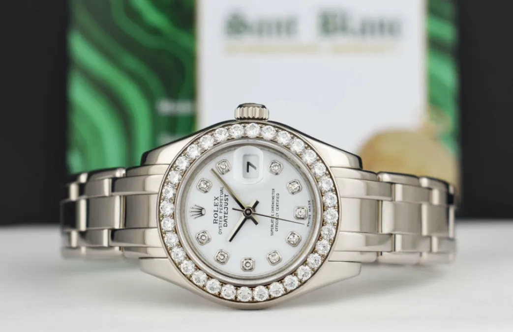 ROLEX REHAUT – This Pearlmaster is a later model with Inner Bezel Engraving (Rehaut)! Absolutely Stunning brilliant Rolex White Diamond Dial! This is the 29mm size 18kt White Gold Rolex Ladies Datejust Pearlmaster model 80299: This is the style with the Rolex 18kt White Gold bracelet. This Rolex is in pristine condition…Priced to sell immediately!